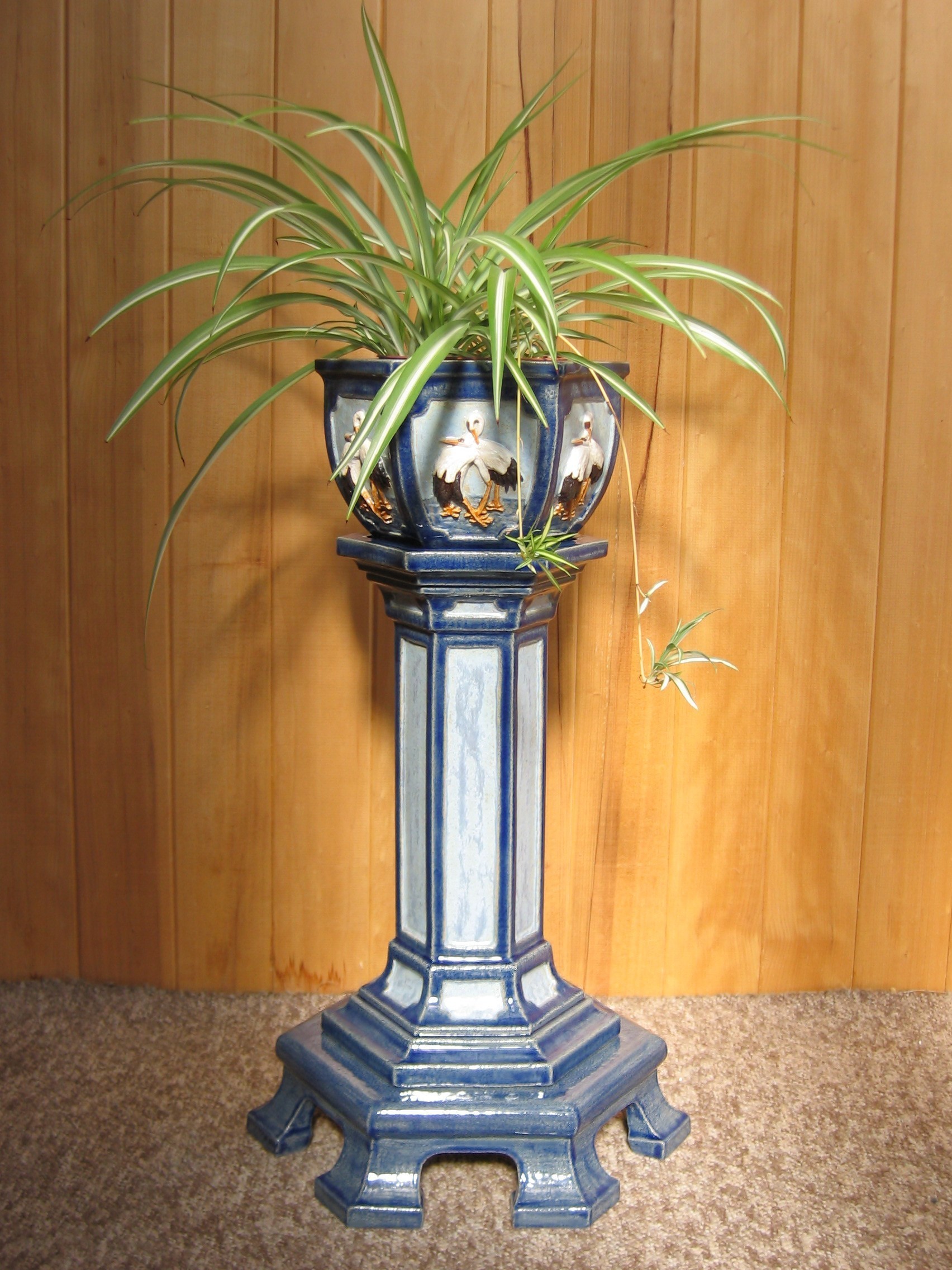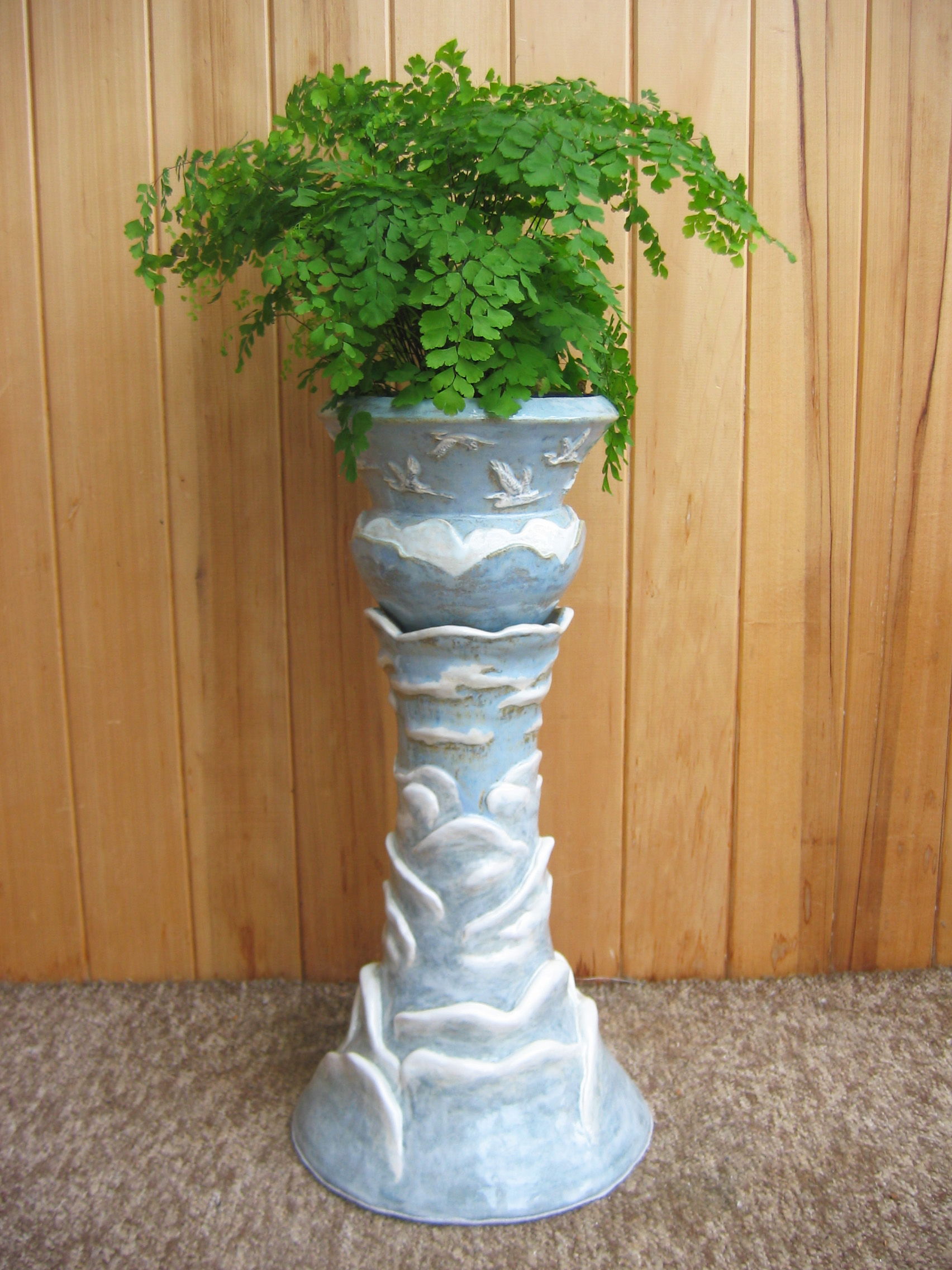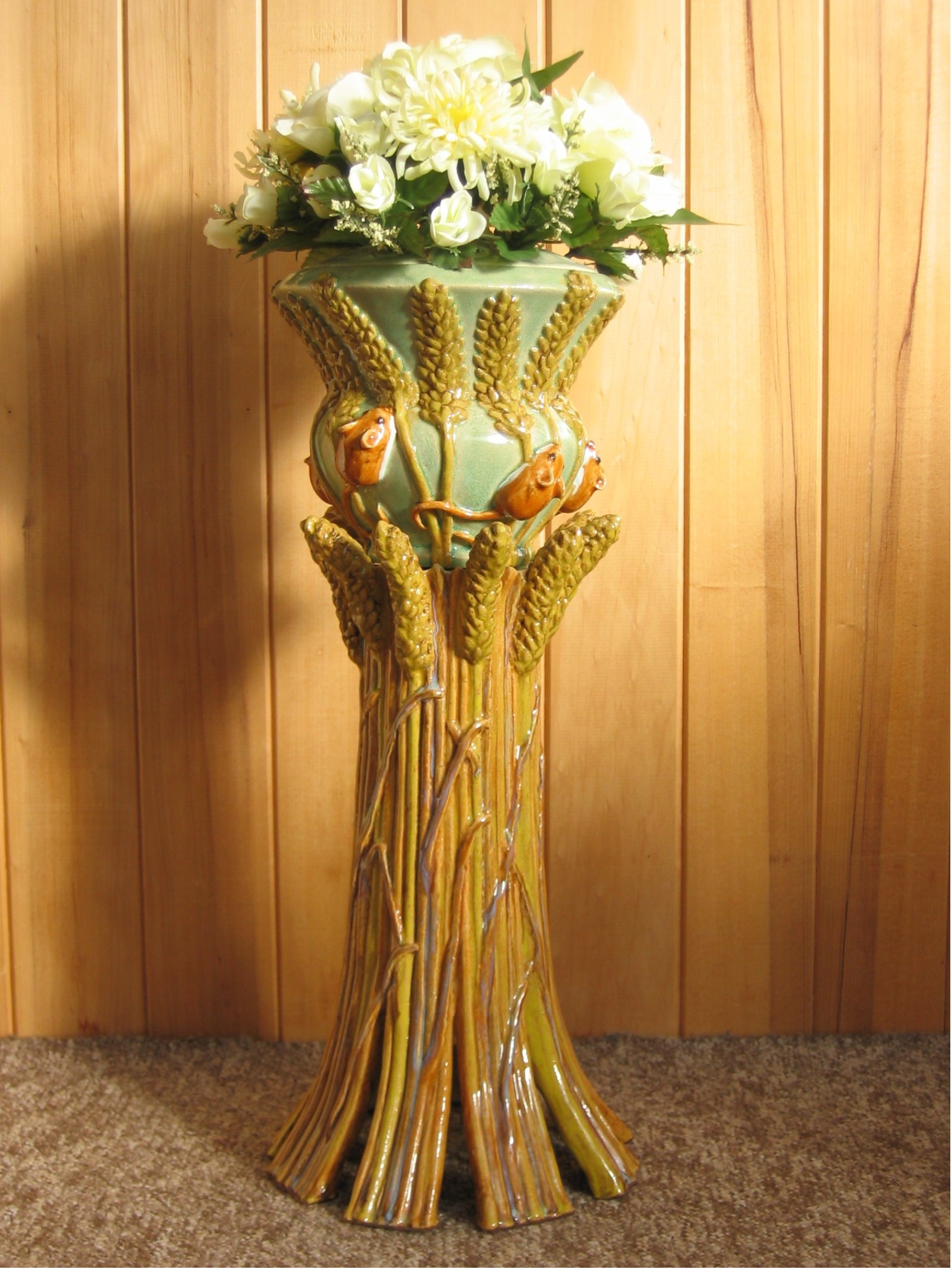 Evolving on from planters, my very first pedestal jardinier was in a style of a birds nest. There is a Wisteria outside my studio in which blackbirds nest each year at the top of the trunk. My idea was to produce a pedestal as the tree trunk, and place the vase, decorated as a birds nest, sitting between the branches. I produced both plain and decorated varieties of jardinier during this time.