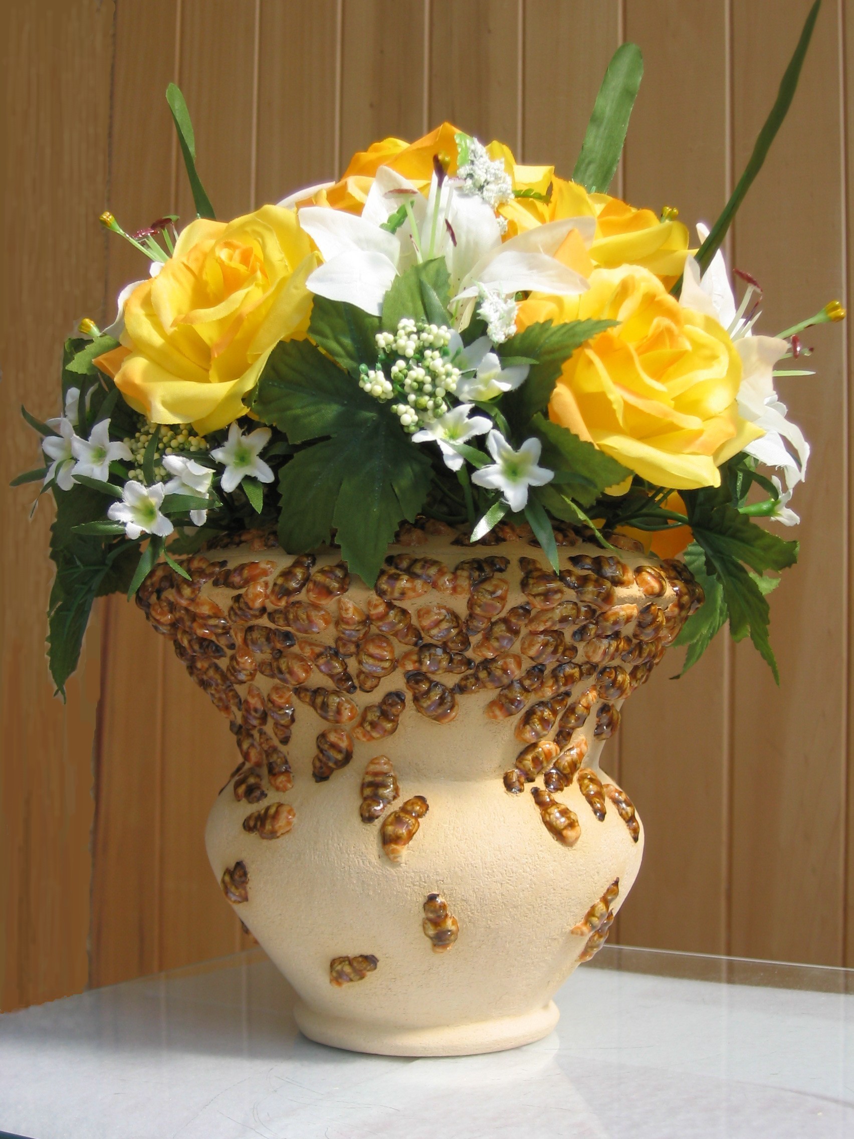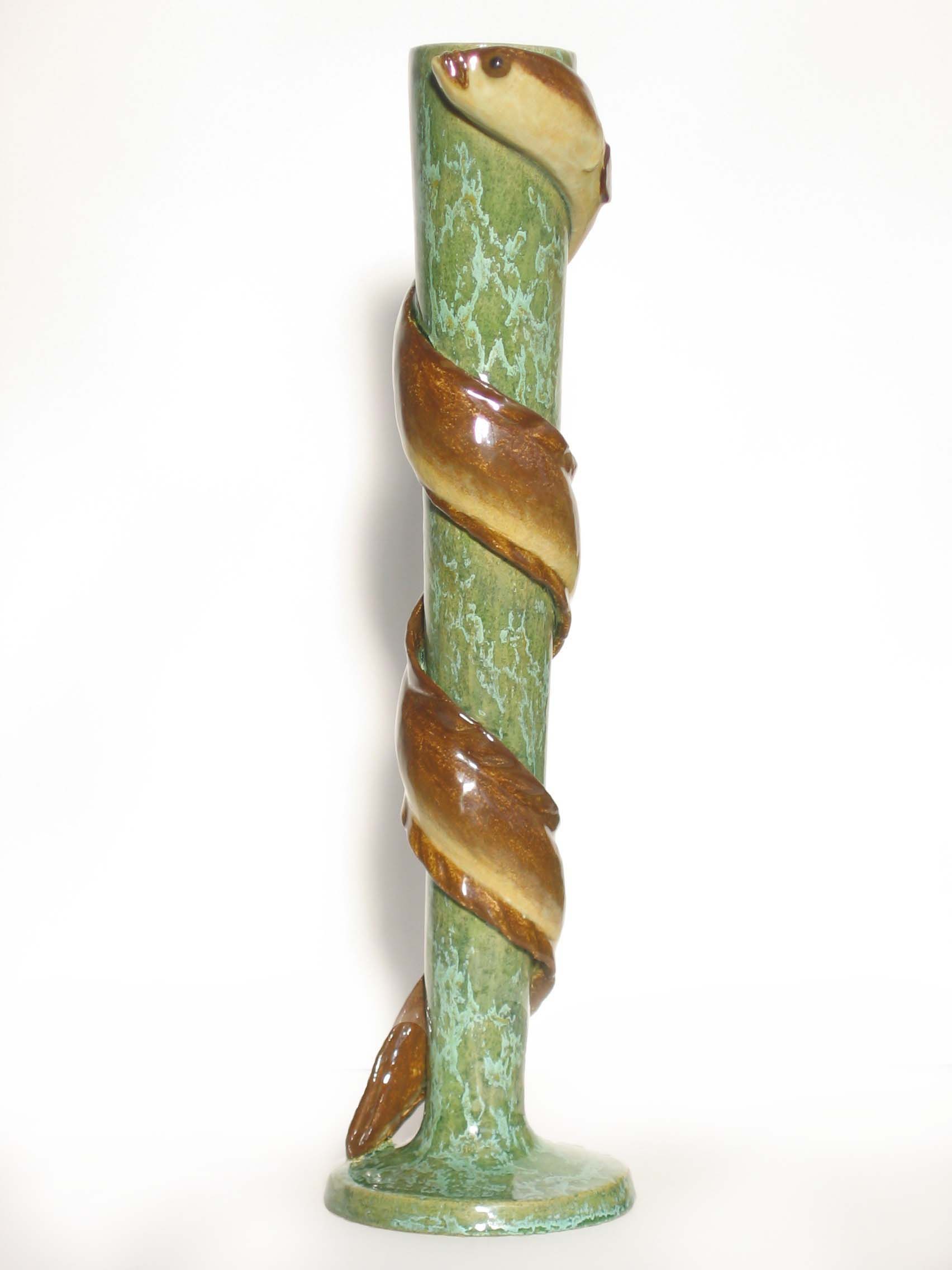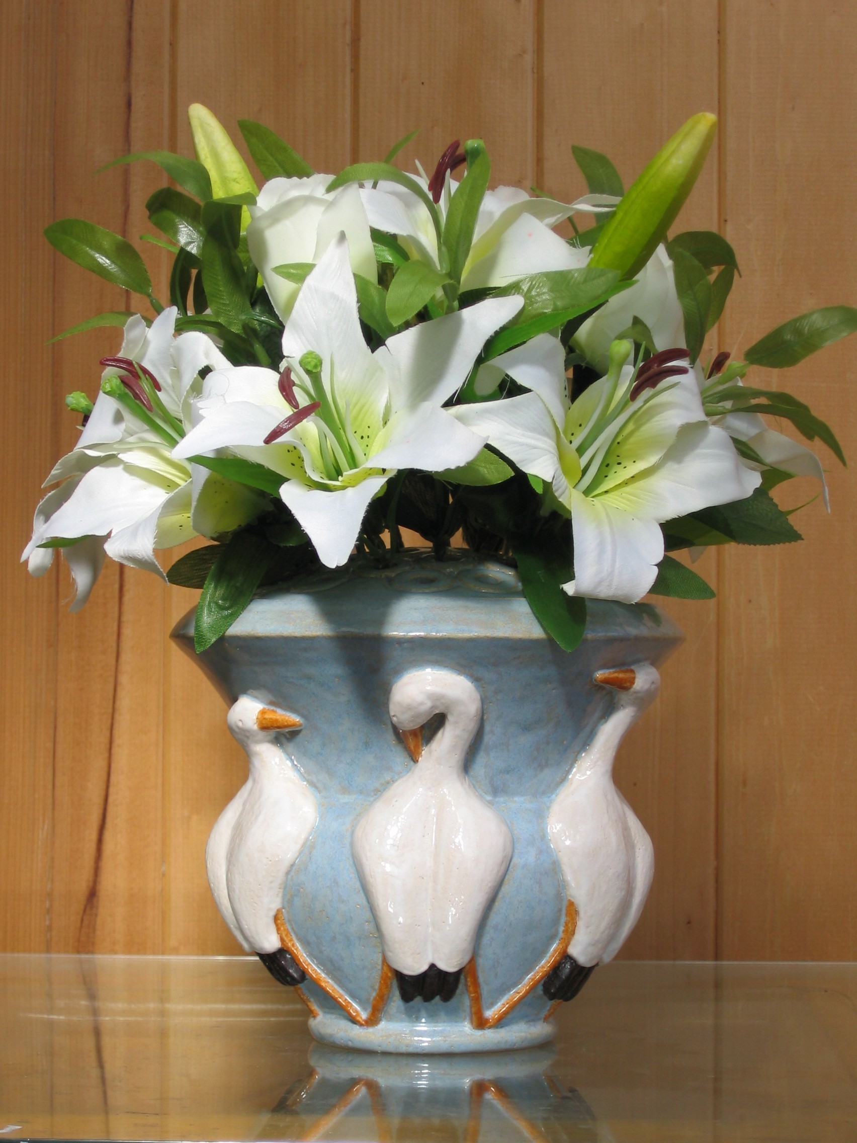 Evolving on from planters, my very first pedestal jardinier was in a style of a birds nest. There is a Wisteria outside my studio in which blackbirds nest each year at the top of the trunk. My idea was to produce a pedestal as the tree trunk, and place the vase, decorated as a birds nest, sitting between the branches. I produced both plain and decorated varieties of jardinier during this time.
