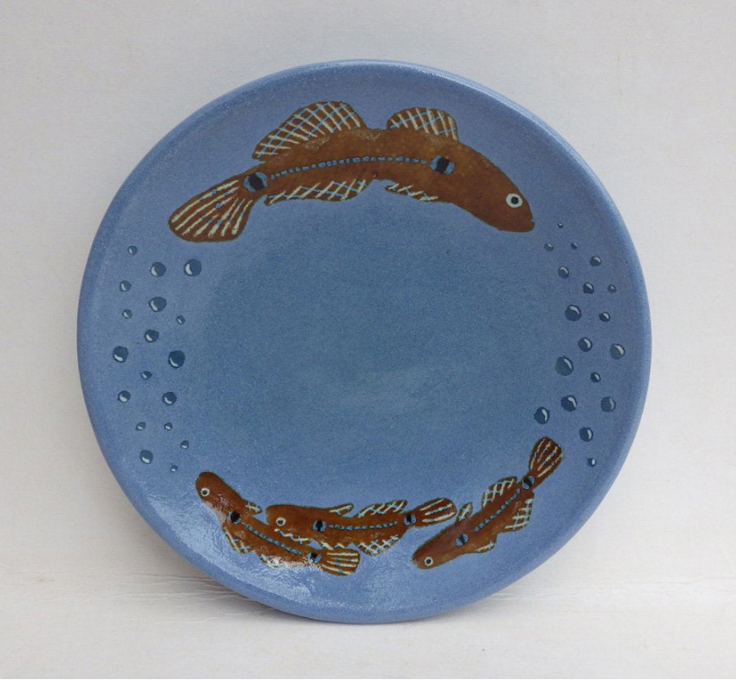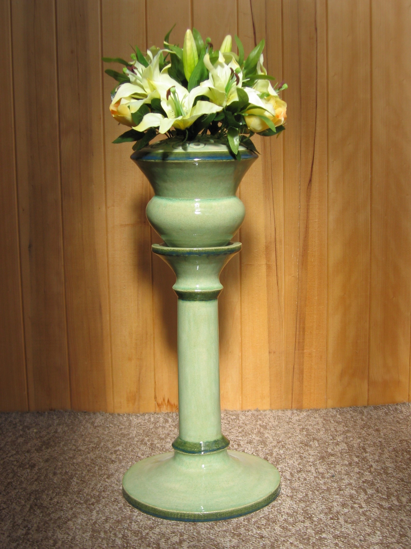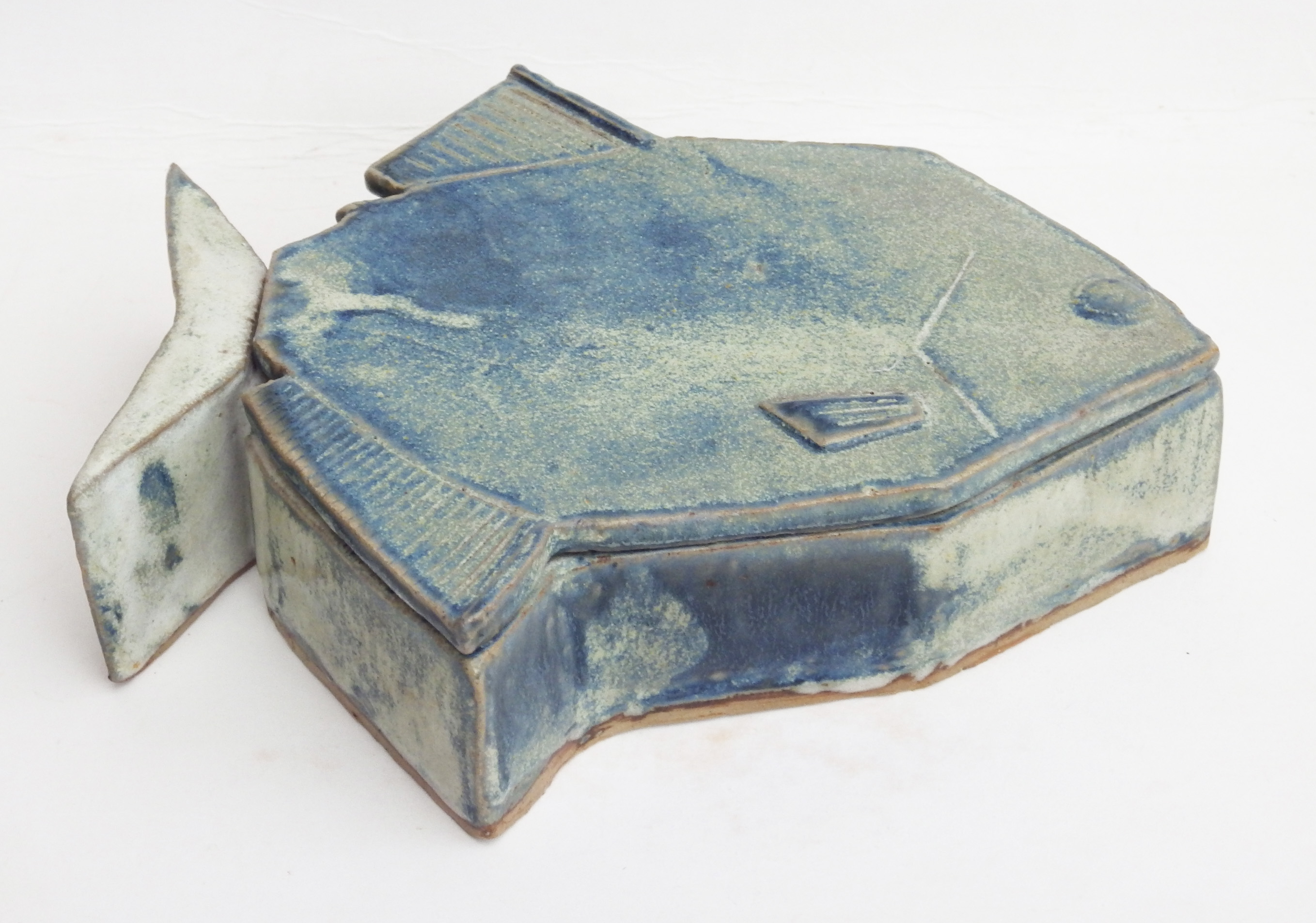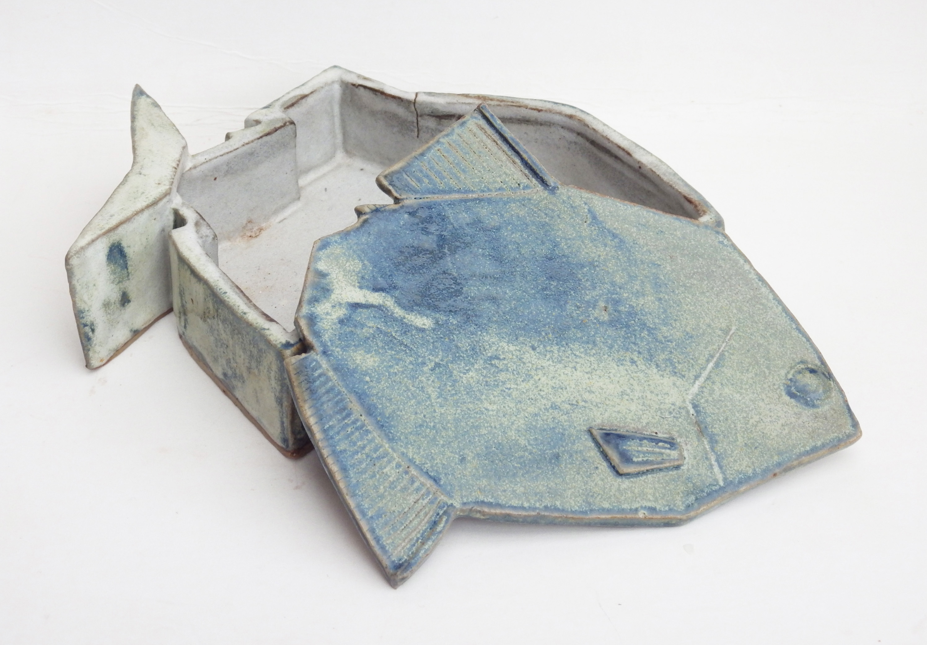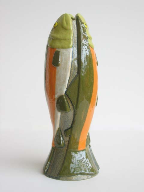 A lidded fish dish made in 4th year school, and a tall floor vase.